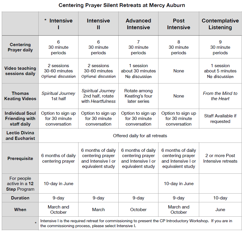 Mercy Center offers 9-day and 10-day Centering Prayer Retreats led by an experienced Contemplative Outreach team.